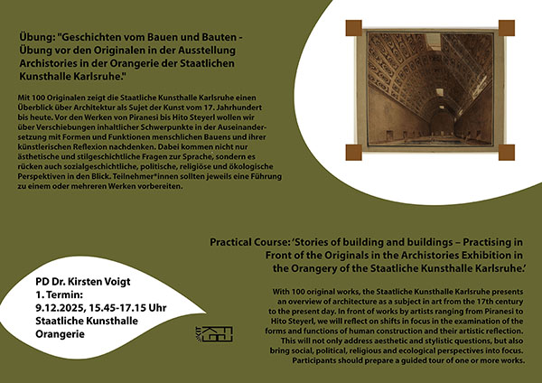 ![]() Geschichten vom Bauen und Bauten - Übung vor den Originalen in der Ausstellung Archistories in der Orangerie der Staatlichen Kunsthalle Karlsruhe PD Dr. Kirsten Voigt |